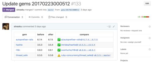 2/18(土) と 2/25(土) に Speee さんのもくもく会に参加して、 gem が出来たので紹介。 speee.connpass.com bundler_diffgems bundler_diffgems は bundle update を支援するための CLI ツールで、GitHub の比較URL を簡単に表示できます。*1 インストール方…